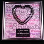An 8” square frame. A Heart shaped horseshoe coated in a luxurious chrome finish. An entire background of personalised typography will be placed underneath the shoe. A personalised plaque placed underneath the shoe engraved onto a silver appearance metal plaque 70mm x 40mm The shoe and plaque will be inset within the typography mount and all enclosed within an approx. 8” square sumptuous silver finished metal frame.